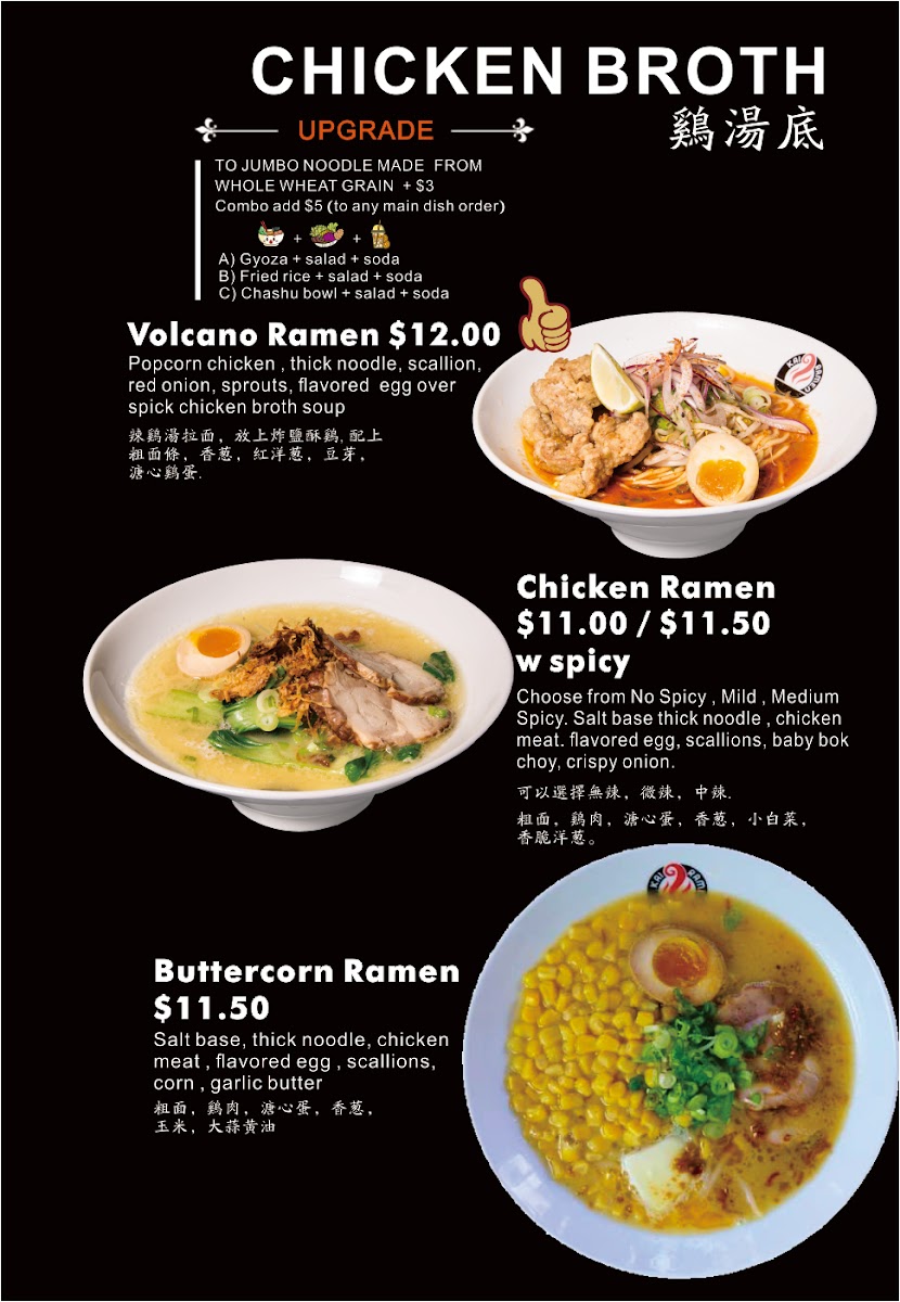 For those preferring chicken, the Kai Ramen #2 section offers a range of delicious options. The Volcano Ramen is fiery and exciting, while the Spicy Chicken Ramen balances spice and savory flavors perfectly. The Chicken Ramen is a classic choice, and the Butter Corn Ramen provides a creamy and comforting option.