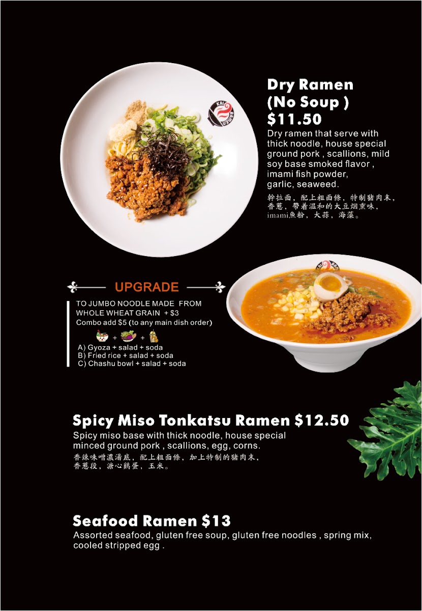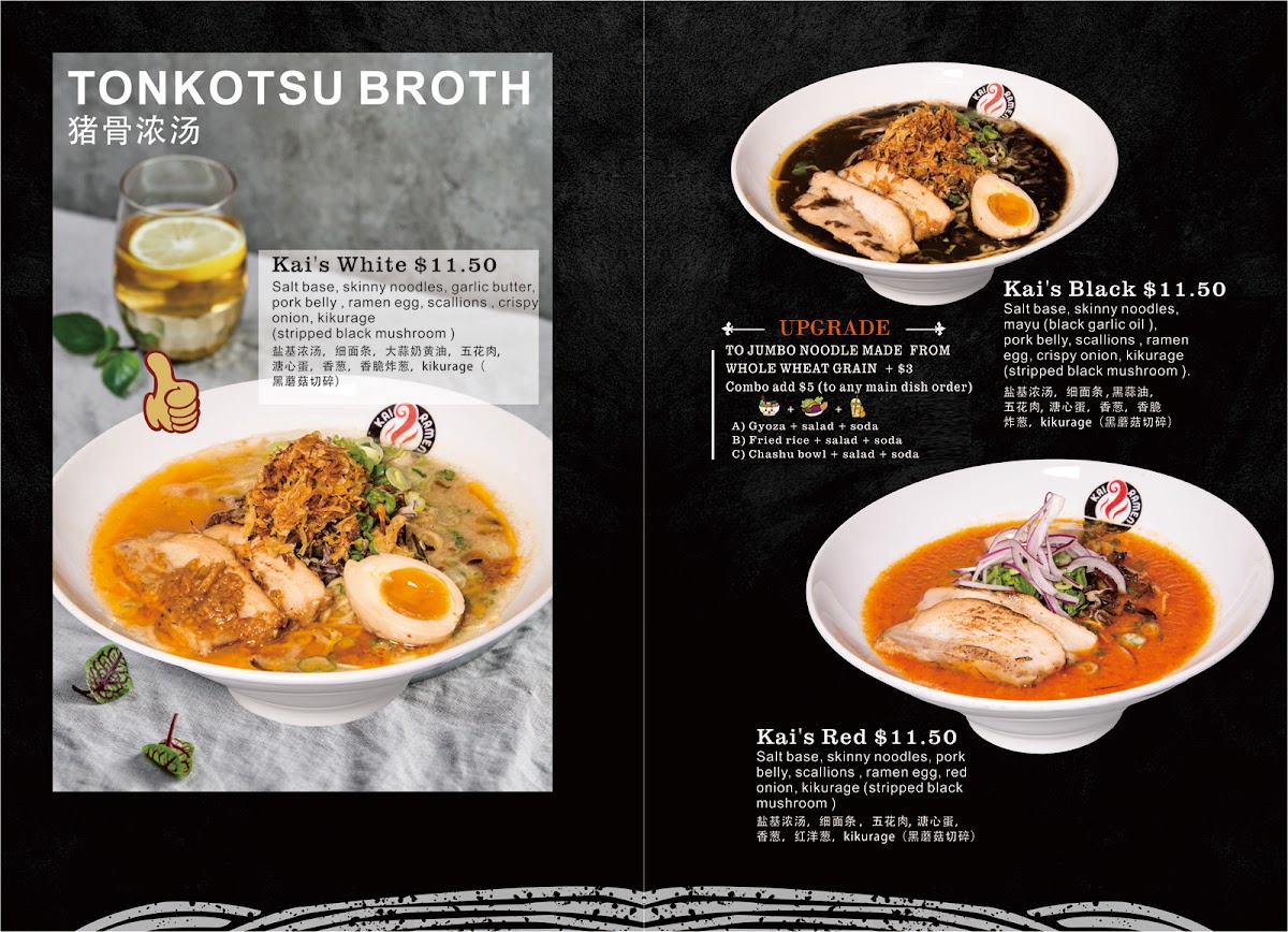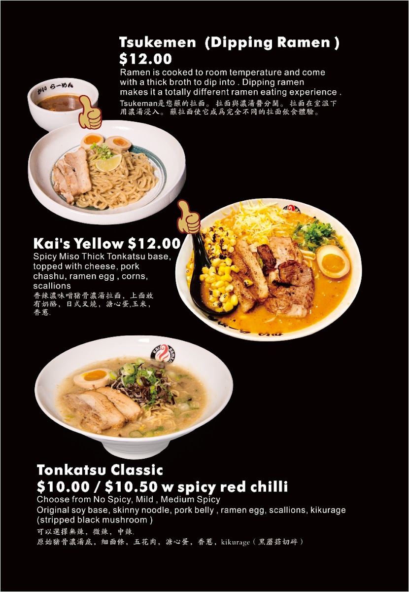 The Kai Ramen #1 section is a haven for pork lovers, with rich and flavorful options such as Kai's White Ramen, Kai's Red Ramen, and the intense Kai's Black Ramen. For a twist, the Tsukemen Ramen is served with a side of dipping broth, while the Spicy Miso Tonkotsu offers a spicy kick for those who enjoy a bit of heat in their ramen.
