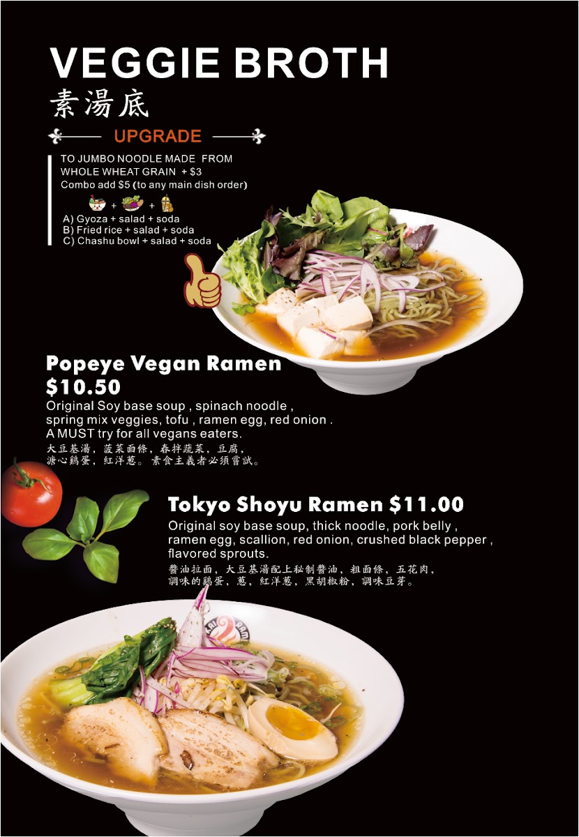 Original Shoyu Plant base soup with home made spice, thick noodle, sukiyaki sliced beef, flavored egg, scallion, red onion, crushed black pepper.